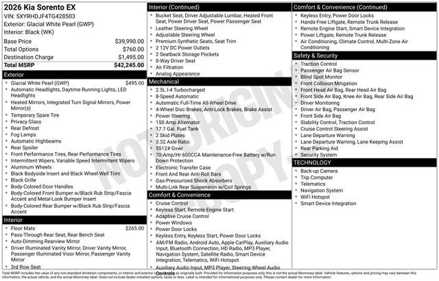Price does not include tax, title, license, registration, or dealer installed options. Price Includes :$3000 - KFA Dealer Choice Program: $3000 discount and 5.25% APR for 36 months. $30.08 per $1000 financed. Available to well qualified buyers who finance through Kia Finance America. 506. Exp. 05/04/2026 Dealer Discount of $1,709 off MSRP Priced below KBB Fair Purchase Price! Glacial White Pearl 2026 Kia Sorento EX 4D Sport Utility AWD 2.5L I4 DGI Turbocharged DOHC 16V LEV3-SULEV30 281hp 8 Speed Dual Clutch 20/27 City/Highway MPG AWD/4WD, Backup Camera, Bluetooth® Handsfree, Navigation, Wireless Phone Charger, Lane Keeping Assist & Lane Following Assist, Driver Attention Warning, Blind-Spot Detection, LED Headlights, Android Auto and Apple CarPlay, blue tooth, 3rd row seats: split-bench, 4-Wheel Disc Brakes, 6 Speakers, ABS brakes, Active Cruise Control, Air Conditioning, All Weather Floor Mats, Alloy wheels, AM/FM radio: SiriusXM, Apple CarPlay & Android Auto, Auto High-beam Headlights, Auto-dimming Rear-View mirror, Automatic temperature control, Brake assist, Bumpers: body-color, Delay-off headlights, Driver door bin, Driver vanity mirror, Dual front impact airbags, Dual front side impact airbags, Electronic Stability Control, Emergency communication system: 911 Connect, Exterior Parking Camera Rear, Four wheel independent suspension, Front anti-roll bar, Front Bucket Seats, Front Center Armrest, Front dual zone A/C, Front fog lights, Front reading lights, Fully automatic headlights, Heated door mirrors, Heated Front Bucket Seats, Heated front seats, Illuminated entry, Knee airbag, Leather Shift Knob, Leather steering wheel, Low tire pressure warning, Navigation System, Occupant sensing airbag, Outside temperature display, Overhead airbag, Overhead console, Panic alarm, Passenger door bin, Passenger vanity mirror, Power door mirrors, Power driver seat, Power Liftgate, Power passenger seat, Power steering, Power windows, Radio data system, Radio: AM/FM Standard Sound System, Rear anti-roll bar, Rear reading lights, Rear seat center armrest, Rear side impact airbag, Rear window defroster, Rear window wiper, Remote keyless entry, Security system, Speed control, Speed-sensing steering, Split folding rear seat, Spoiler, Steering wheel mounted audio controls, SynTex Artificial Leather Seat Trim, Tachometer, Telescoping steering wheel, Tilt steering wheel, Traction control, Trip computer, Turn signal indicator mirrors, Variably intermittent wipers, Wheels: 20 Machine-Finished Gloss Black Alloy. Internet price reflects all qualifying rebates and discounts. Customer must qualify, see dealer for details (765)250-5220.