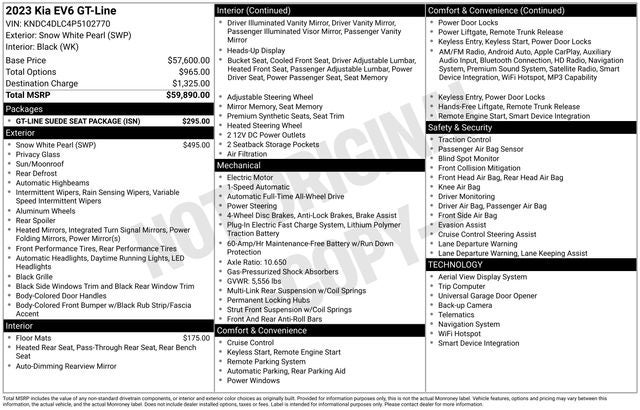The exterior of this EV6 shines in the Snow White Pearl color, complemented by the stunning GT-LINE SUEDE SEAT PACKAGE, which features a Black Seat Color with White Accents and Carpet Floor Mats.