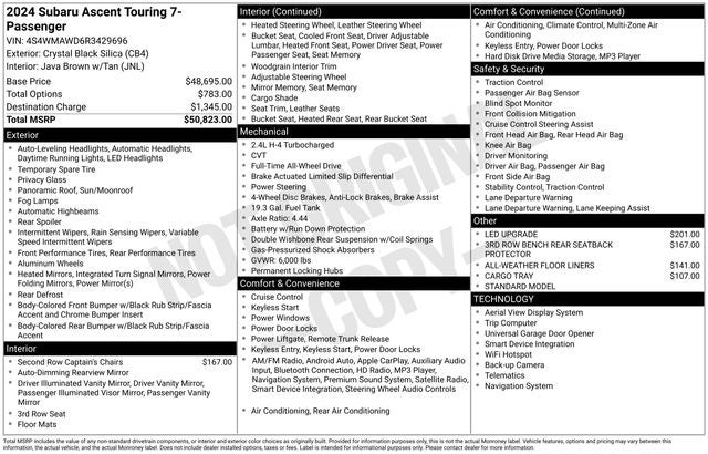 Discover the ultimate family-friendly SUV with the 2024 Subaru Ascent Touring. This meticulously maintained and well-equipped vehicle is a true testament to Subaru's commitment to quality and safety. With its spacious interior, advanced technology, and exceptional all-wheel-drive capabilities, the Ascent Touring is the perfect companion for your next adventure.