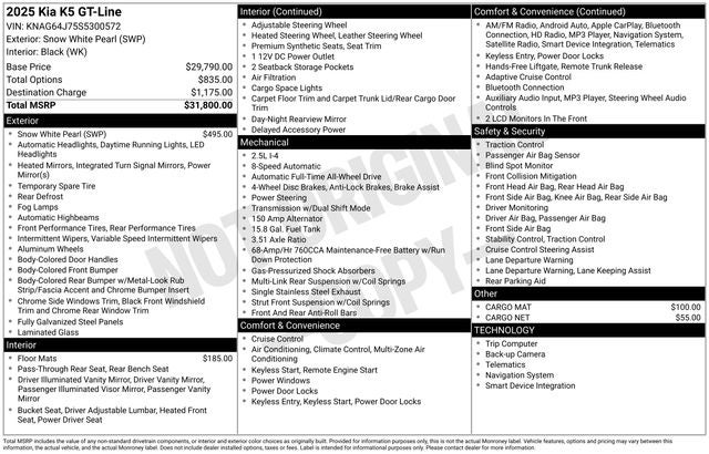 In addition to its impressive list of custom features, this Kia K5 also boasts a stunning Snow White Pearl exterior, complemented by a host of convenient and premium amenities, including Carpeted Floor Mats, Cargo Mat, and Cargo Net.